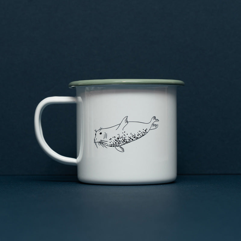 Have you swum with seals before? This design shows a grey seal swimming past in the graceful way they're renowned for. It's laser etched on to enamel mugs in Cornwall, take them camping or keep in your van for a cuppa!