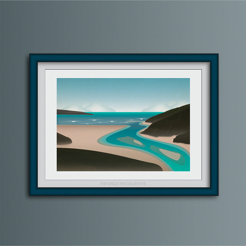 Our Crantock design depicts one of our favourite beaches in Cornwall. We have just one print second in this design which unfortunately was delivered from our printer with a little dent in. Once it's framed and on the wall we don't believe that you will notice the imperfection.