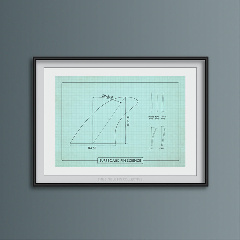 Our Fin Science art print shows some of the design principles involved in making surfboard fins. We have a couple of prints with minor imperfections available.