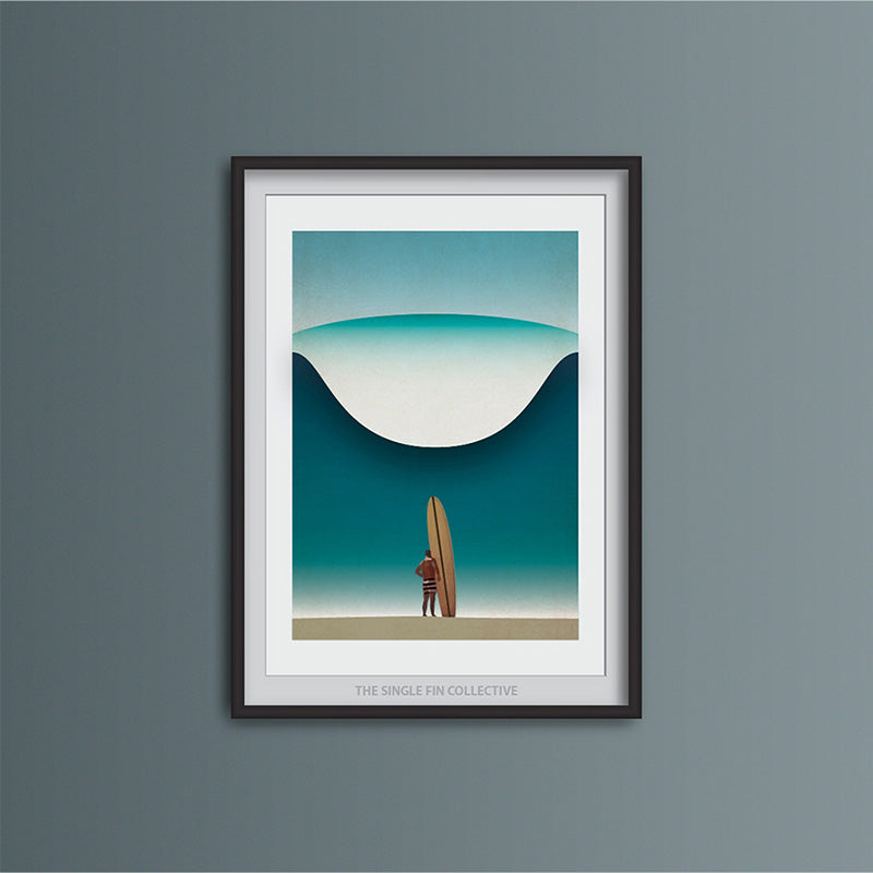 One of our most popular prints, this art print shows a surfer standing in front of a large wave with his surfboard. We have a number of print seconds of this design where the prints have some small white dots on them.