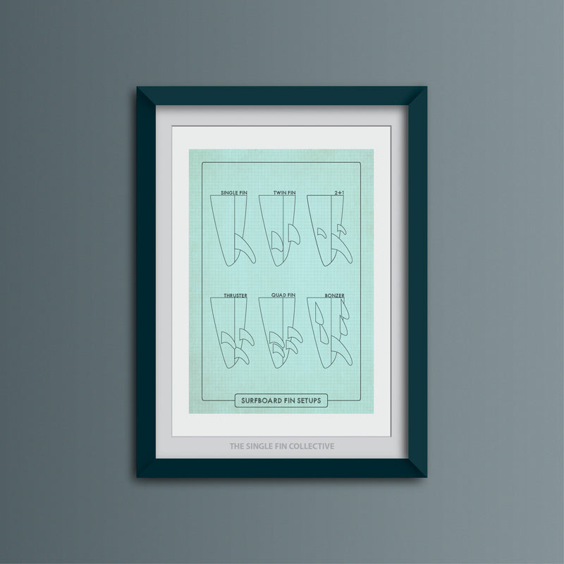 Our Fin Set-ups design shows the more popular ways of setting up the fins on your surfboard as well as the rarer! We have a couple of prints with imperfections available.