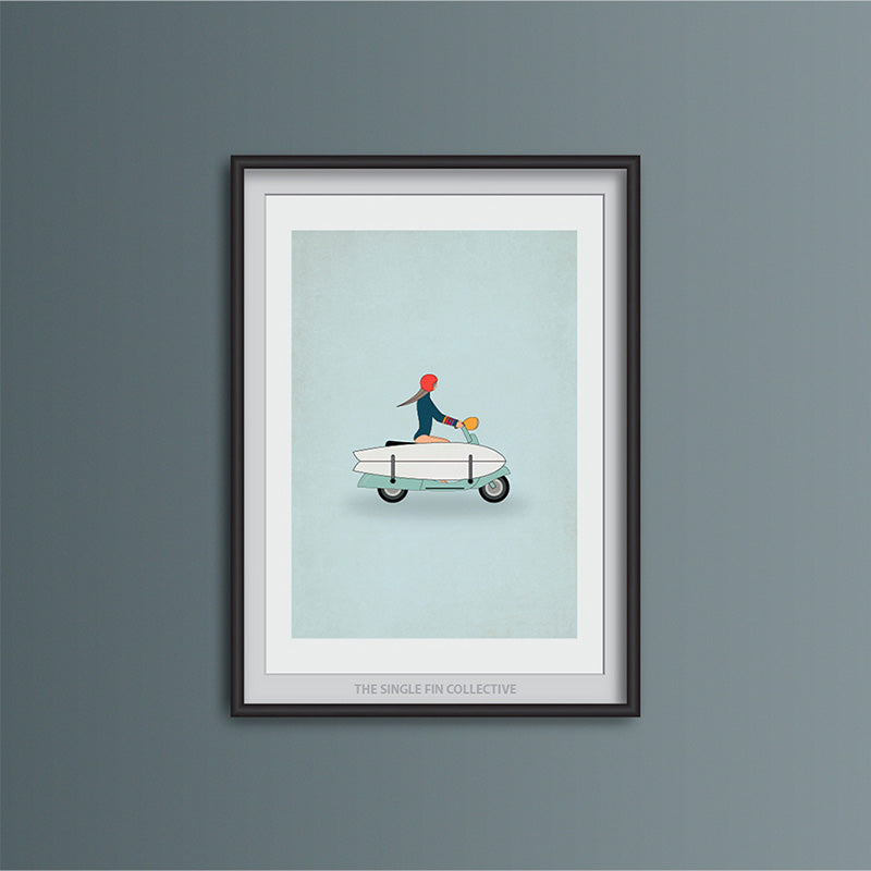 Our travel series shows a surfer on a variety of modes of transport, in this one it's a Vespa! We have a couple of prints with very small imperfections.