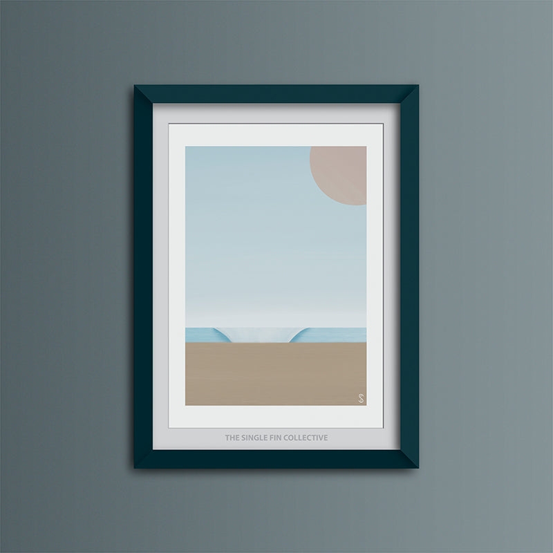 This simple design has a calm palette showing an unridden wave breaking along a beach. We have a couple of these art prints available with some small imperfections. Once the prints are framed and on the wall, we don't believe that you will notice the imperfections, and the prints will still look fantastic. But we just aren't comfortable selling them at full price!