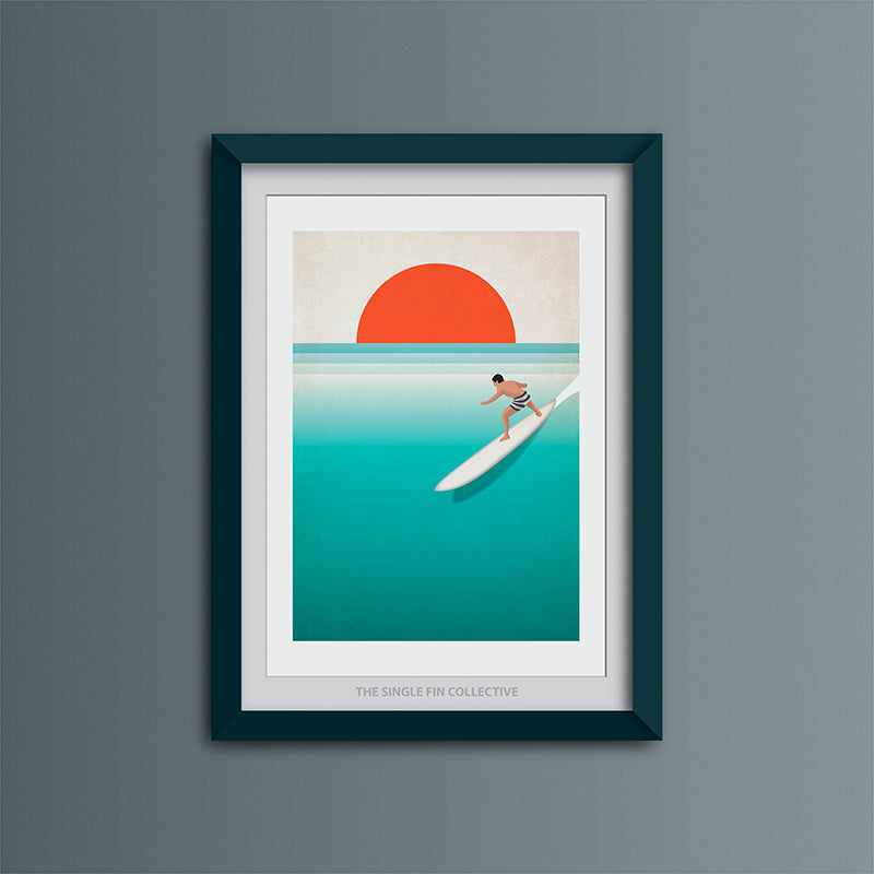 This design pops with colour and shows a surfer on a tropical wave, we have a few with a small dark marks on. Once the prints are framed and on the wall we don't believe that you will notice the imperfections, and the prints will still look fantastic. But we just aren't comfortable selling them at full price!